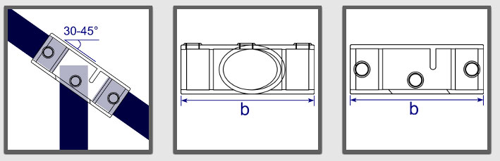 Adjustable from 30° to 45°, often used on staircase top rails. This Interclamp can be used where the top rail must be joined at the fitting. Where such a joint is not required, type 129 can often be used as an alternative. Often used in conjunction with type 130.