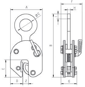 | Model | WLL kg* | Jaw (Z) capacity mm | A mm | B mm | C mm | D mm | E mm | F mm | G mm | H mm | I mm | Weight kg** |